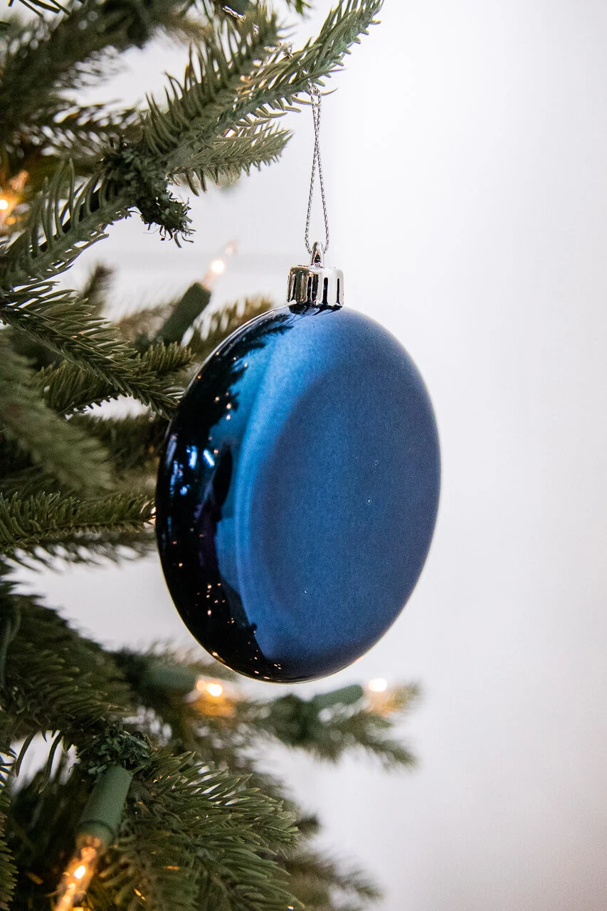These 10cm disk ornaments (set of 6) bring delightful midnight blue glam to any deeply colored Christmas tree look. Perfect for filling in spots, they will reflect light and add a little more magic to your Christmas tree design.