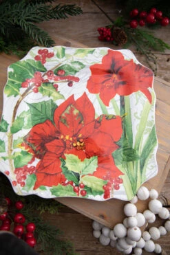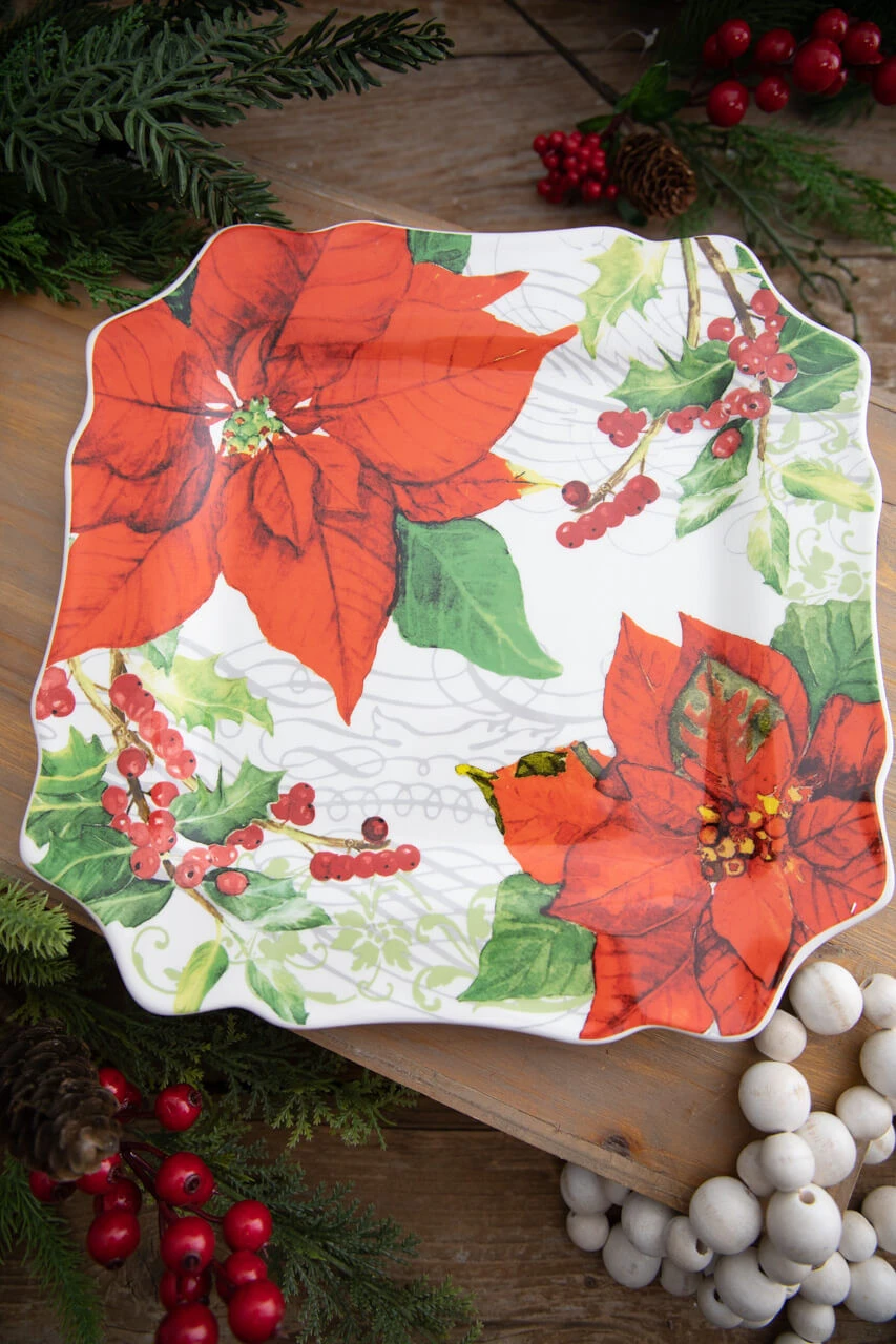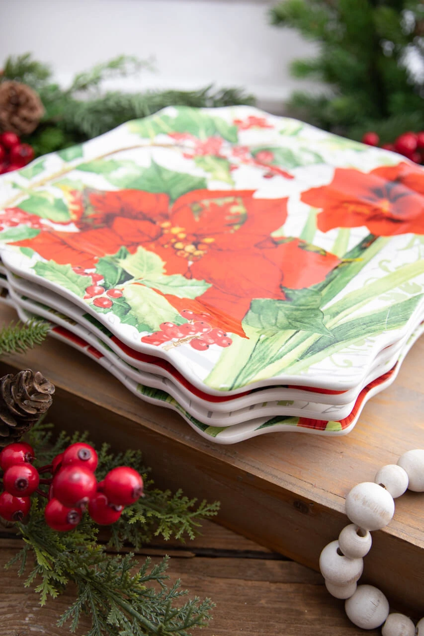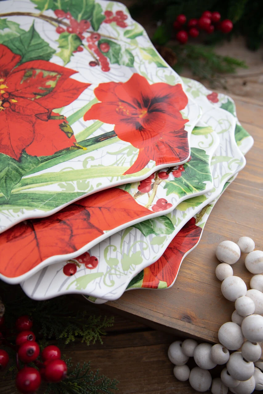 Enjoy the beauty of the season with this set of four ceramic dinner plates featuring bright red poinsettias and lush berries. A perfect addition to your Christmas dinner table, these 12β plates will bring a festive and elegant touch to your holiday celebrations. A wonderful way to tie together your Christmas decor, these plates make perfect gifts for family and friends.