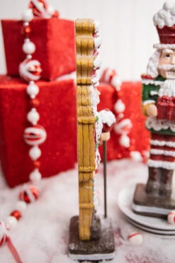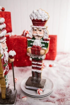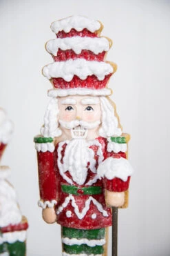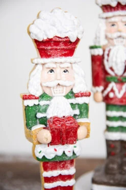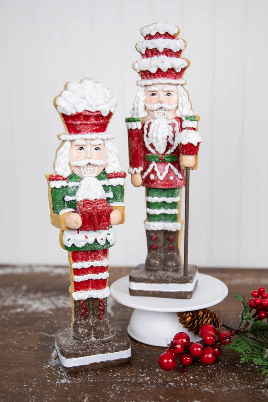Add a festive touch to your holiday dΓ©cor with this 13β Resin Gingerbread Nutcracker. Choose from either a green nutcracker holding a present or a red one regally holding a staff. Both pieces feature vibrant colors and frosted details for a classic seasonal look. Place this whimsical figurine in any room to add to your nutcracker themed decorations.