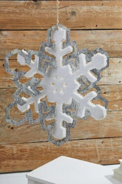 Add a statement piece to your holiday decorations with this 17.5โ Hanging Snowflake Ornament. The white frosted snowflake is outlined in grey detail for a sophisticated look. Hang this oversized ornament from your tree or in a window for a stunning visual effect. Perfect for adding a touch of wintery elegance and rustic decor to your home.