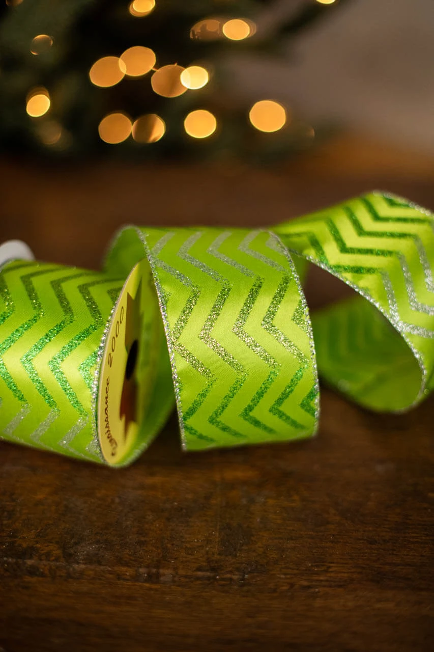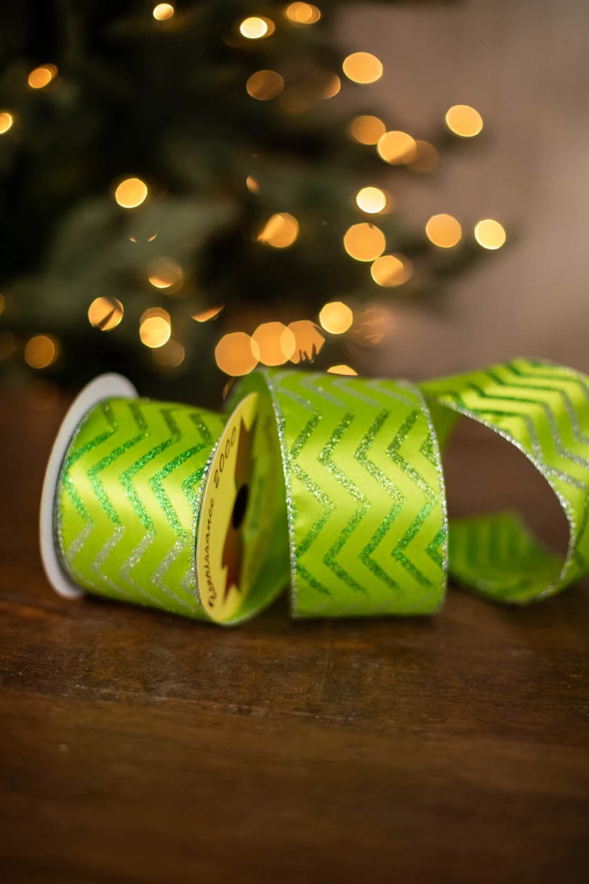 Whether you are creating a magical Grinch display or wanting a fun color-pop throughout your tree, our silver/green ribbon is your go-to. The glitter waves have an ombre look flowing from silver to green with coordinating overstitched wired edges that allow you to decorate with ease.