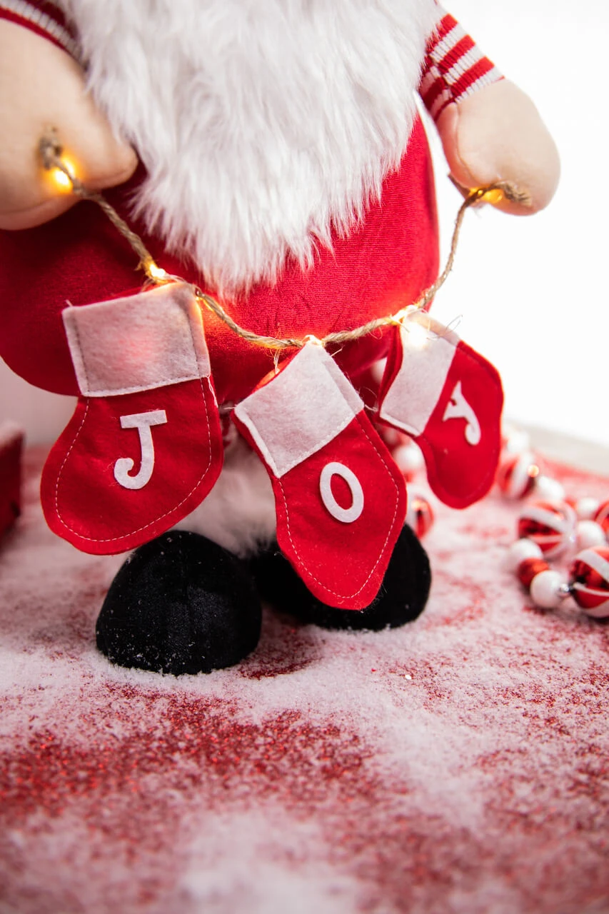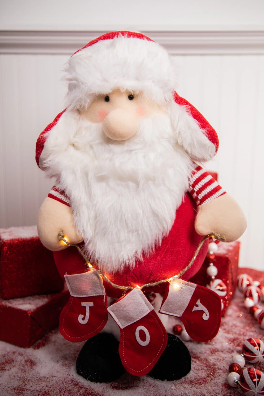 Celebrate the holiday season in style with this 20-36β Telescope Light Up Santa Figure. This festive decoration features telescoping legs that transforms his height from 20β to 36β in seconds. Santa is wearing a traditional red suit and is holding a garland of stockings that say βJOYβ. He is also complete with a soft plush beard and an On/Off switch with three settings that bring this festive figure to life. ***Batteries included (3x LR44 battery)