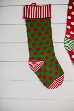 Bring the bold patterns and bright colors everyone loves during the holidays to your mantle with these timeless stockings. The cheerful green, red, and white striped and dotted stockings look like they jumped right off the set of “The Grinch” with their elf-like style. Create a set with one style or alternate both styles for a varied look and hang from a mantle that is decorated with garlands and lights to create a magical display.