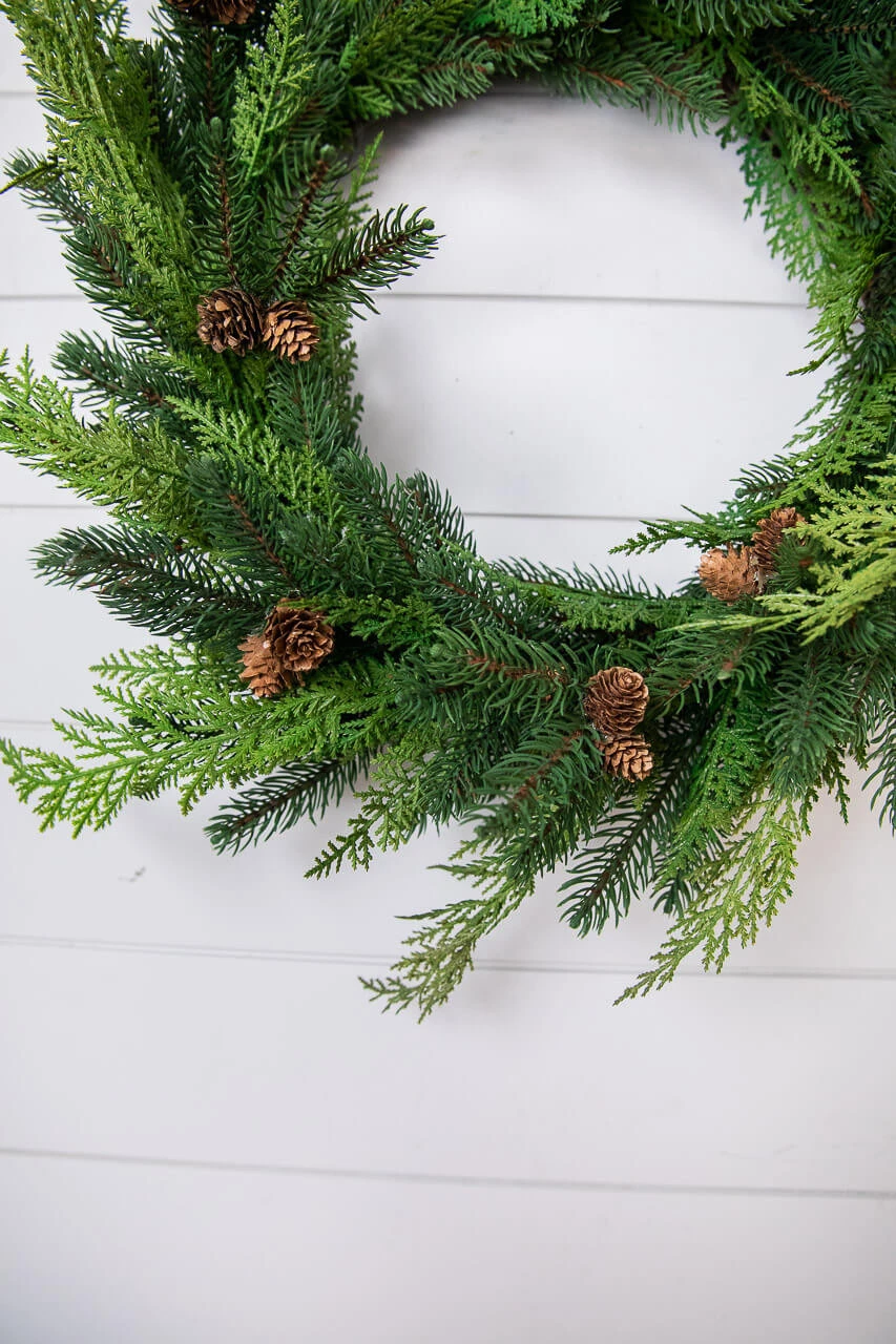 Bring your doorways and windows a bit of cheer this season with our Just Cut Natural Touch Woodland Pines Cedar Wreath. Hang on its own or accent with seasonal decor using beautiful ribbon and berry sprays to warm up your home.