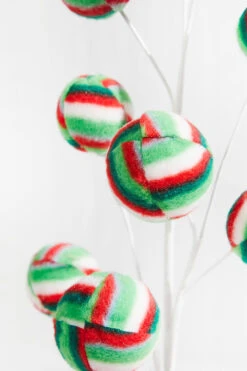 Embrace the magic of yesteryear with our stunning 25β Stripe Ball Ornament Spray – Red/Green/White. These delightful red, green, and white felted ornamental balls capture the essence of a charming holiday season. Add these to your tree for a nostalgic look and let festive cheer fill your home!