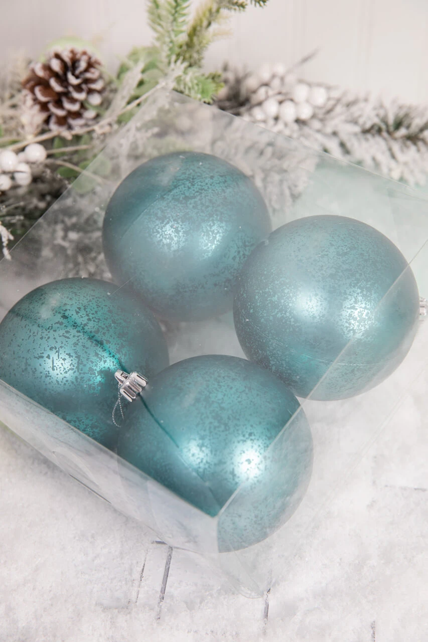 These 3.5″ Aqua Blue Matte Mercury Ball Ornaments are a beautiful addition to any holiday decor. The unique mercury-like detail gives these ornaments a luxurious look, and the stunning shade of aqua is sure to be a favorite for years to come. Each of the four ornaments in this set is crafted from high-quality materials, and is sure to add a touch of elegance to any tree. Create your own theme or add as an accent to your candy and sweets Christmas decorations.