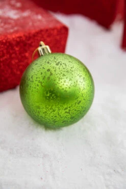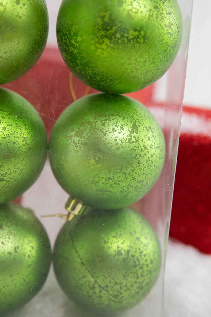 Enhance your holiday decor with a touch of sparkle from this set of six 3″ Apple Green Matte Mercury Ball Ornaments. The matte finish gives the ornaments a subtle gleam, while the mercury-like detail provides a contemporary feel to your tree. Whether hanging from the branches or displayed in an ornament bowl, these ornaments are sure to add the perfect festive touch to your home. Add them to your red and green Christmas decorations to introduce another shade of green as an accent.