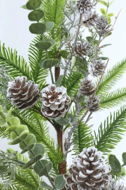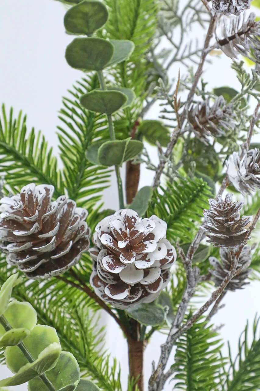 Get ready to captivate your senses with our standout 32″ Eucalyptus Cone Cedar Spray. Artfully arranged frosted pine cones paired with bright green eucalyptus leaves make this piece a unique spectacle of natural beauty. Its versatility makes it perfect for sprucing up your holiday decor or adding freshness to your everyday ambiance. This spray is sure to elevate your space with a beautifully sophisticated touch and goes well with our rustic Christmas decorations and also stands out when paired with our cranberry Christmas tree decor!