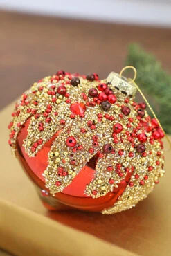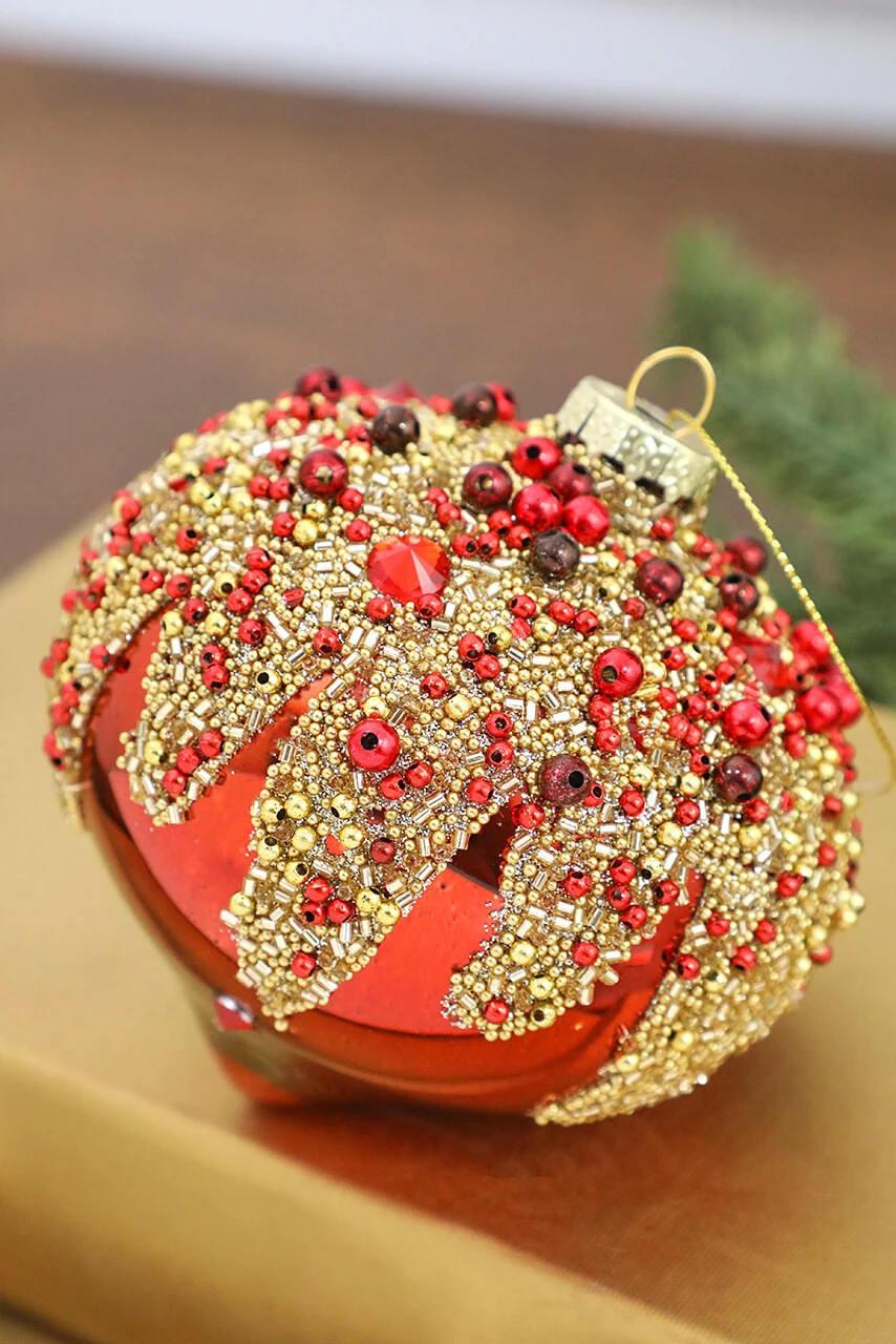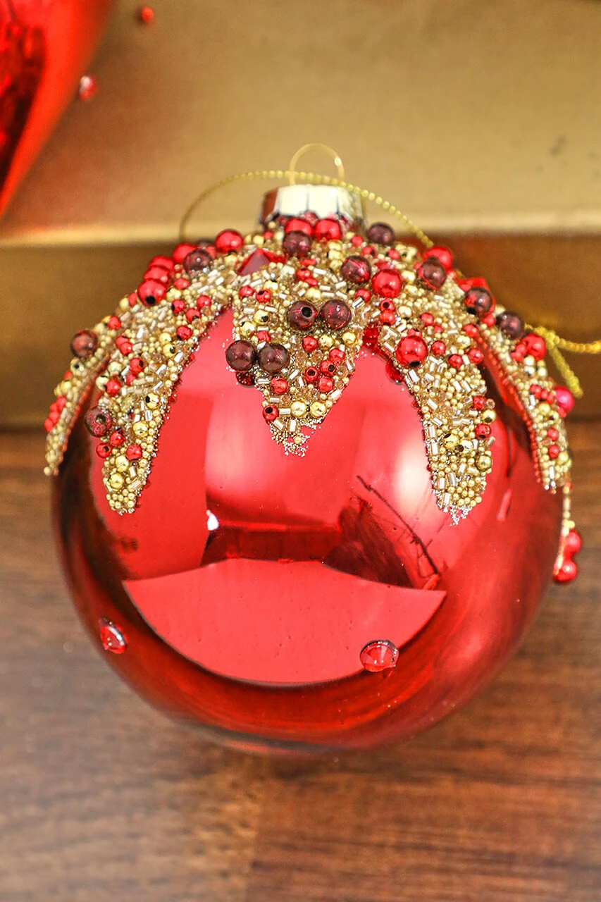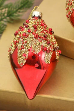 Step up your decorating game this holiday season with our stunning 4β Glass Bead Ornaments, available in three mesmerizing shapes. The rich red glass, dipped in a vibrant mix of bright and dark red beads, and accented with sophisticated gold detail, will make your red and gold Christmas decorations truly unforgettable.