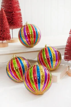 These festive 4″ Multi-Color Stripe Mercury Ball Ornaments come in a set of 4 and feature a playful stripe pattern in an array of bright and cheerful colors, adding a burst of joy to your holiday decor. Measuring 4 inches in diameter, they are perfect for adorning your Christmas tree, wreaths, garlands, or creating lively centerpieces. The lively and colorful stripes bring a spirit of merriment, sure to infuse your home with the energy and excitement of the season.