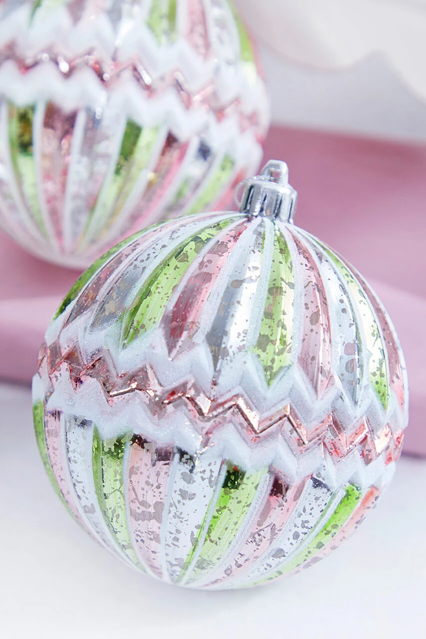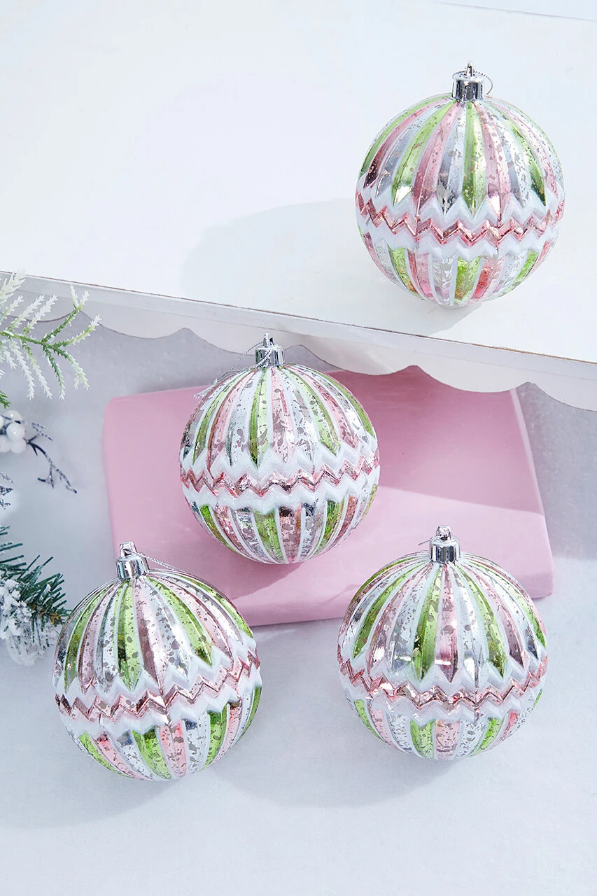 4″ Pink/Green Mercury Ridged With Zigzag Stripe Ball – Set Of 4