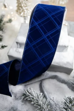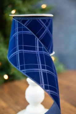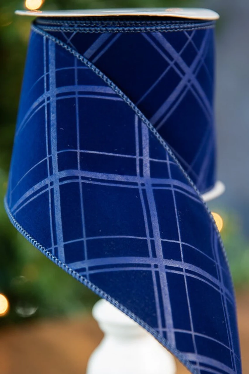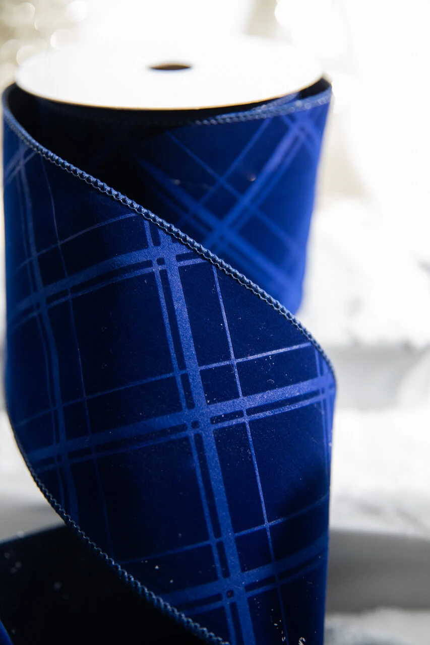 4β X 10 Yard Midnight Blue Embossed Plaid Velvet Wired Ribbon