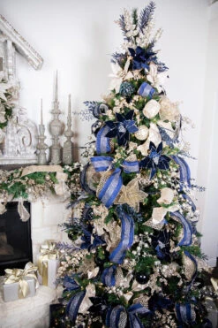Utilize this glitter mesh on luxe navy for a refined, contrasted look as it cascades gracefully through your tree and garlands. This high-end, wired ribbon gives a modern edge toΒ any sophisticated and elegant personalized theme.