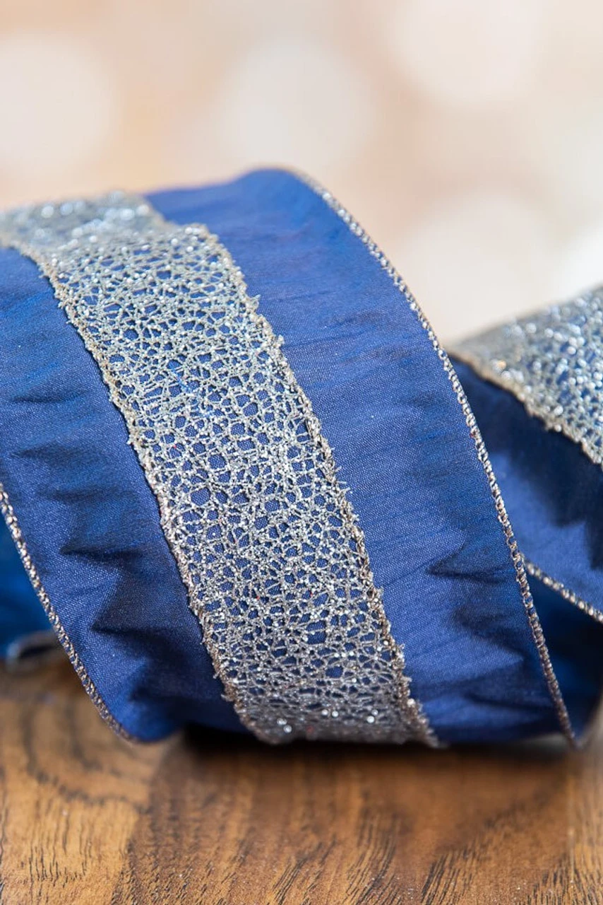 4β X 10 Yard Navy Glitter Mesh Stripe Dupioni Wired Ribbon