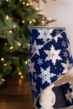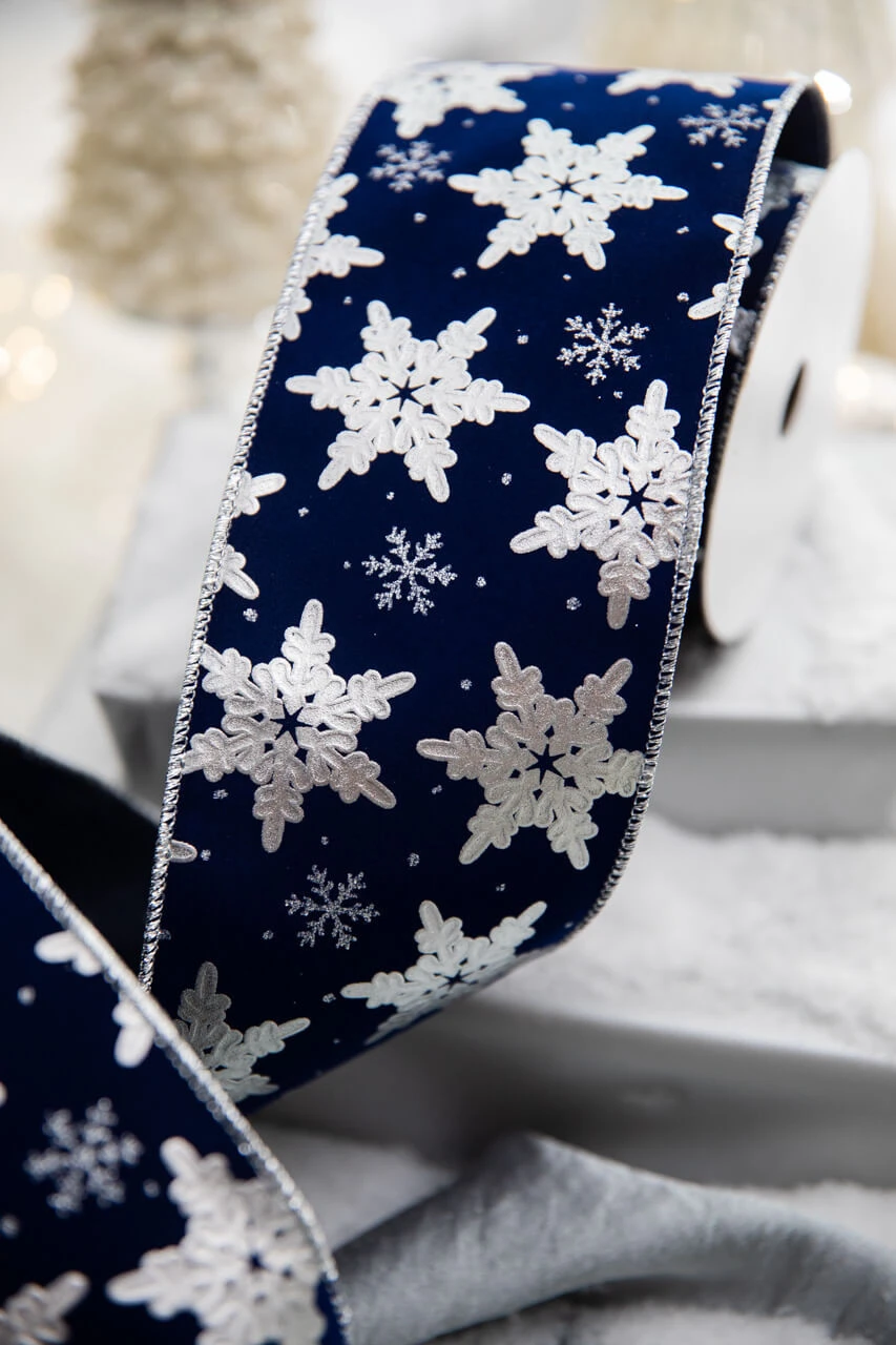 This luxurious navy blue velvet ribbon with wired edging is a staple from our Midnight Frost Collection. Layer the gorgeous snowflake-stitched look with silver and white elements to create a mesmerizing and sophisticated design.