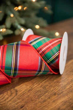 Enjoy this Diagonal Cut Plaid Dupion Fused Ribbon in red and green with black and yellow accent lines! A traditionally-beloved ribbon, it’s a perfect size and material to use on the finest classic looks, whether in the entryway, living room, or dining room.