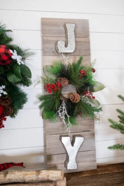 41โ H Wood & Metal โJoyโ Sign With Holiday Wreath