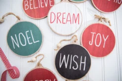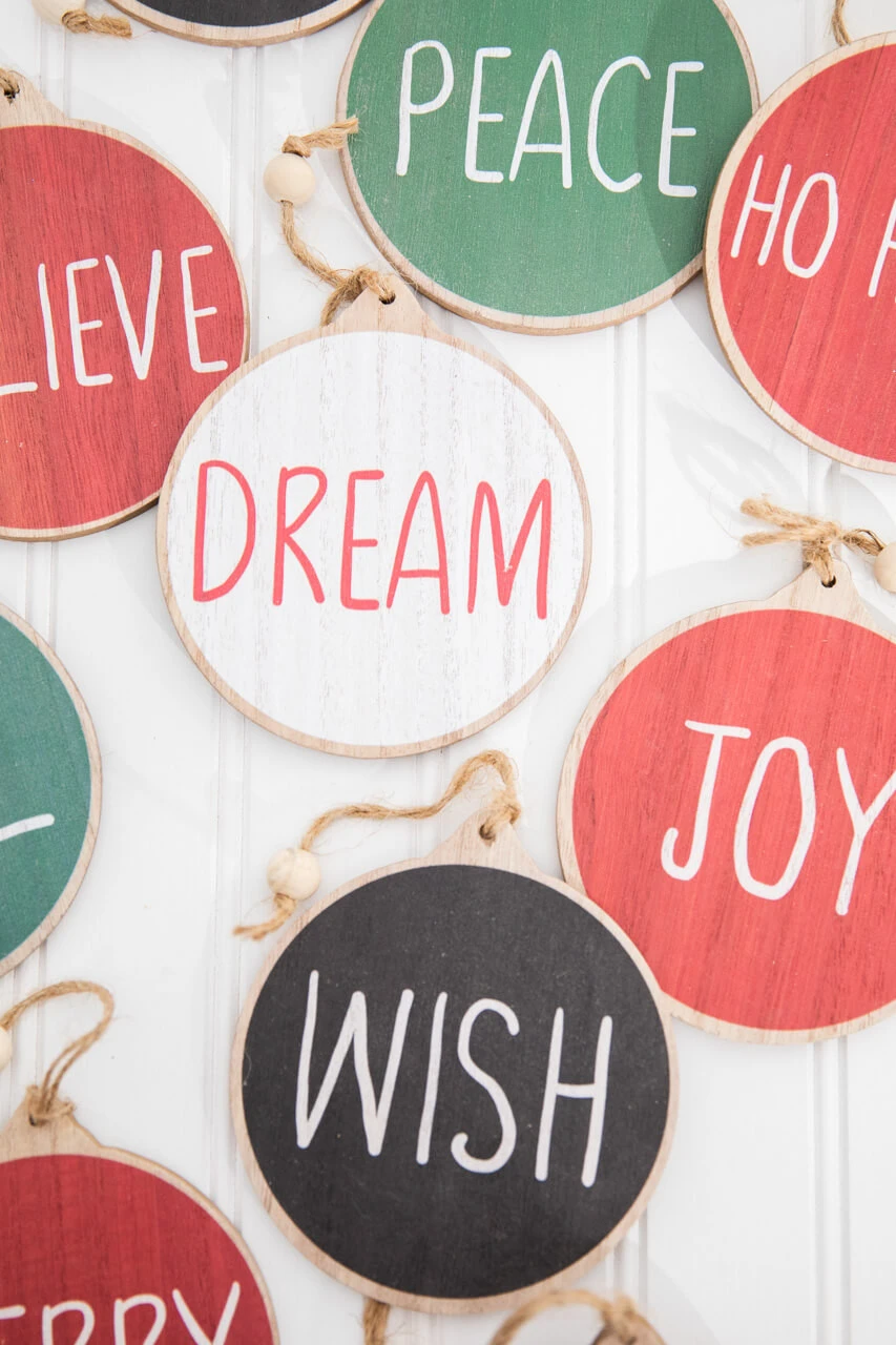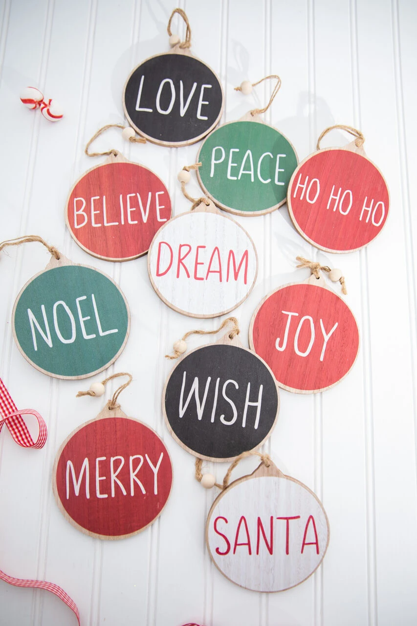 Display your holiday wishes with this beautiful set of ornaments. The muted colors add a rustic charm to your home. Each disc is crafted from wood, and it comes with a jute rope hanger and wooden bead detail for an elegant touch. This set of ten different ornaments is perfect for accenting your farmhouse themed decorations today!