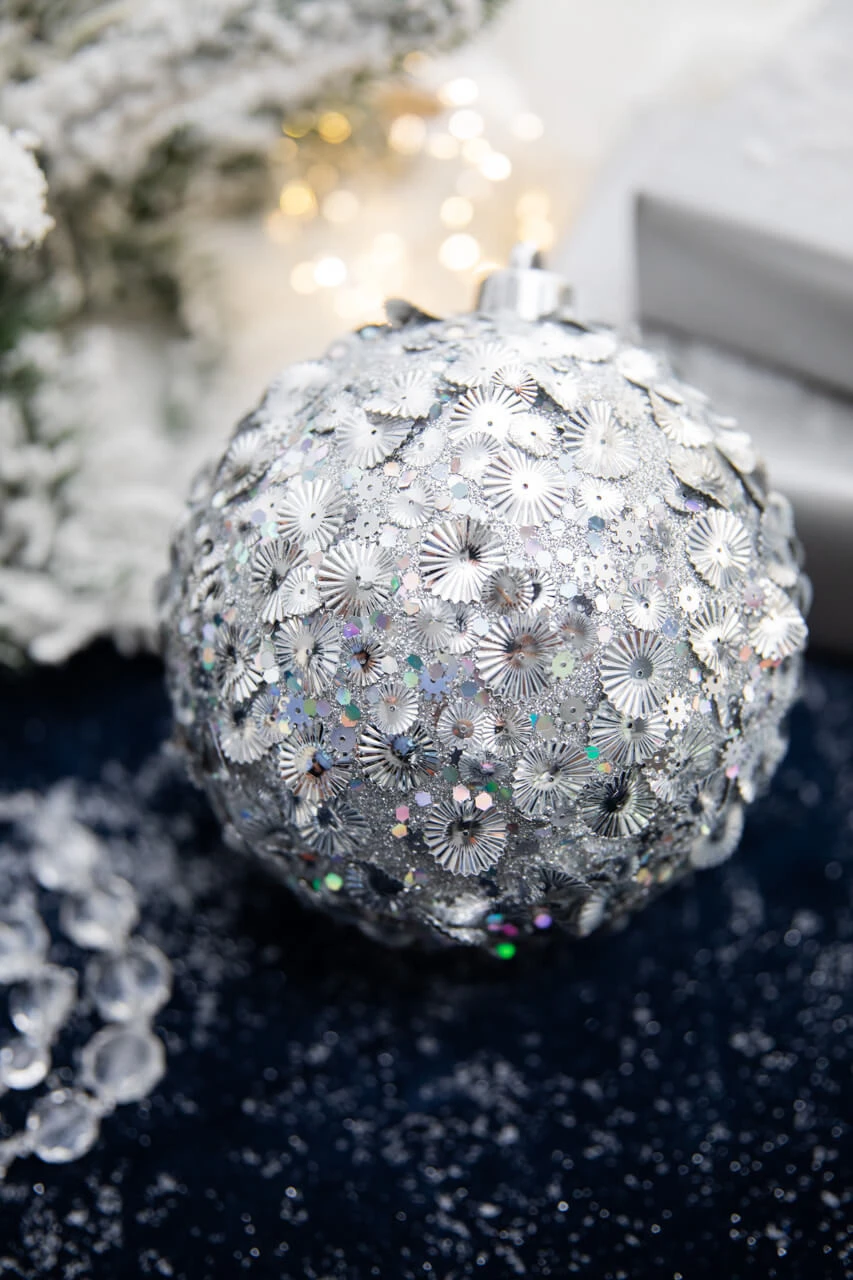 Add a touch of glamour to your holiday decor with this set of two 6β silver ornaments. Each ornament is crafted with lavish layers of silver sequins and has a subtle sparkle that will light up any white Christmas theme. Hang these beautiful ornaments on your Christmas tree, garland or wreath for a festive look.