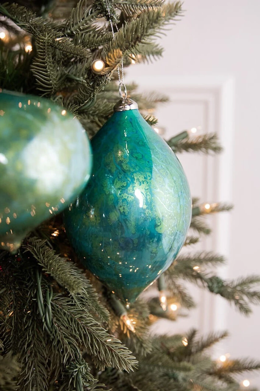 For your beachy or blue and neutral Christmas design, these aqua ornaments have a hand-blown look that makes an on-trend statement. Delicate and perfectly stunning, the onion stands 4.5″ high and the finial stands 8″ high.ย